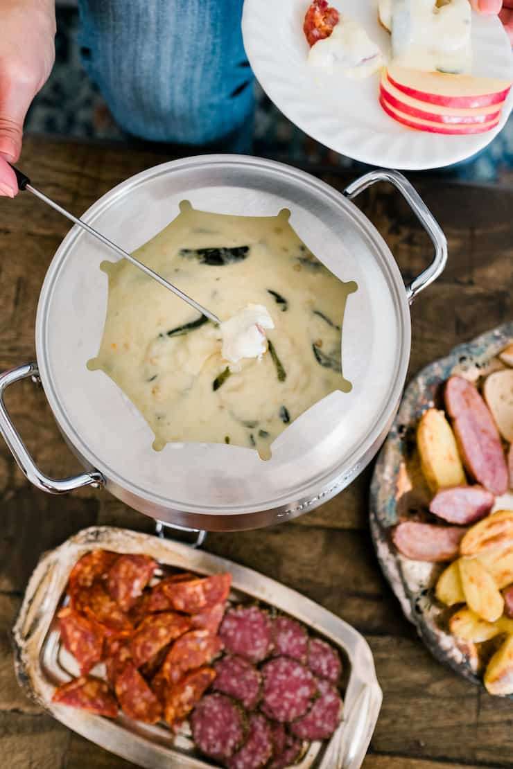This fondue has a Mexican twist made with a combination of two of my favorite cheeses — asadero and muenster cheese. And because I like spice I added rajas of roasted poblano for a mild kick.