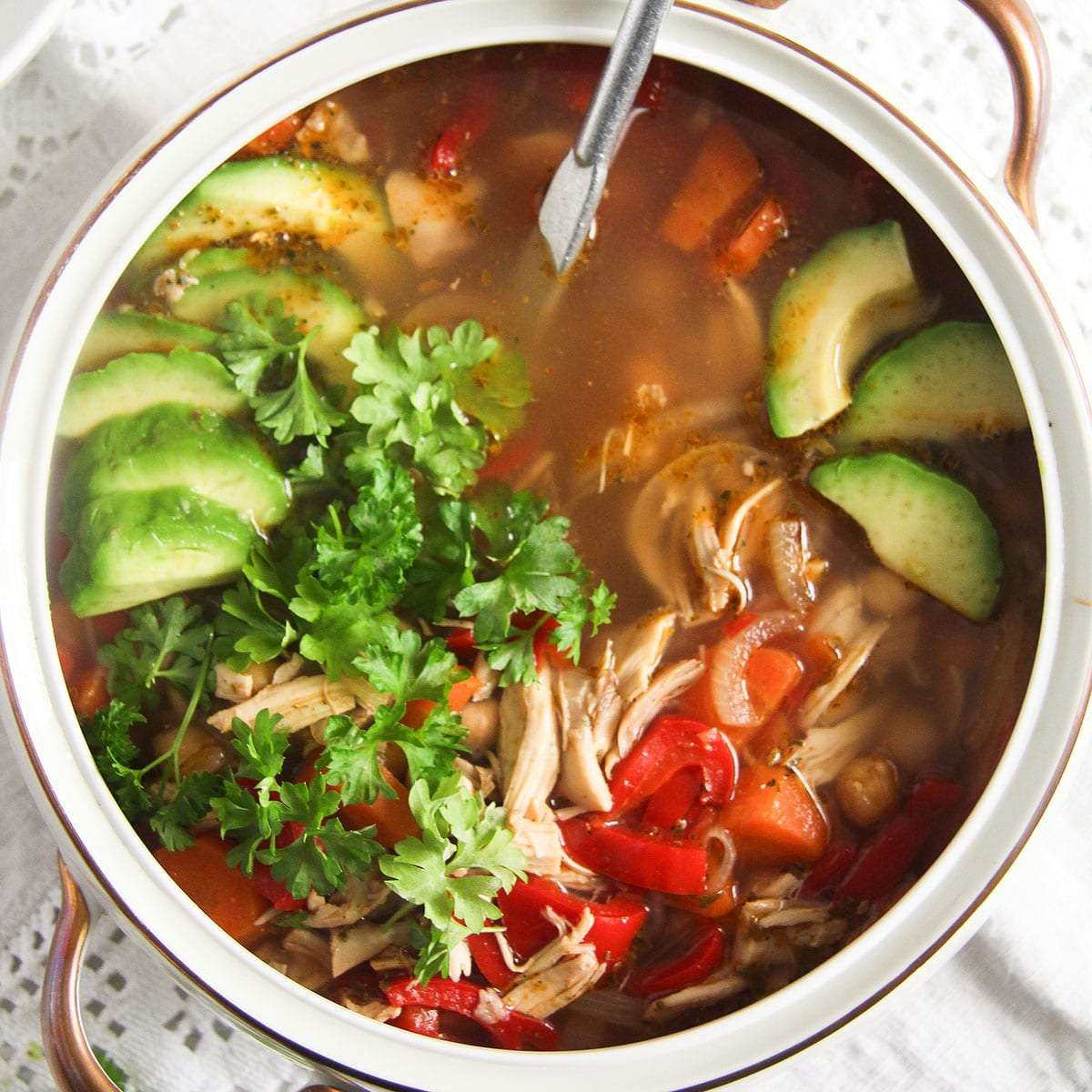 Caldo Tlalpenosoup - spicy Mexican chicken soup with avocado and chickpeas or garbanzo beans.
