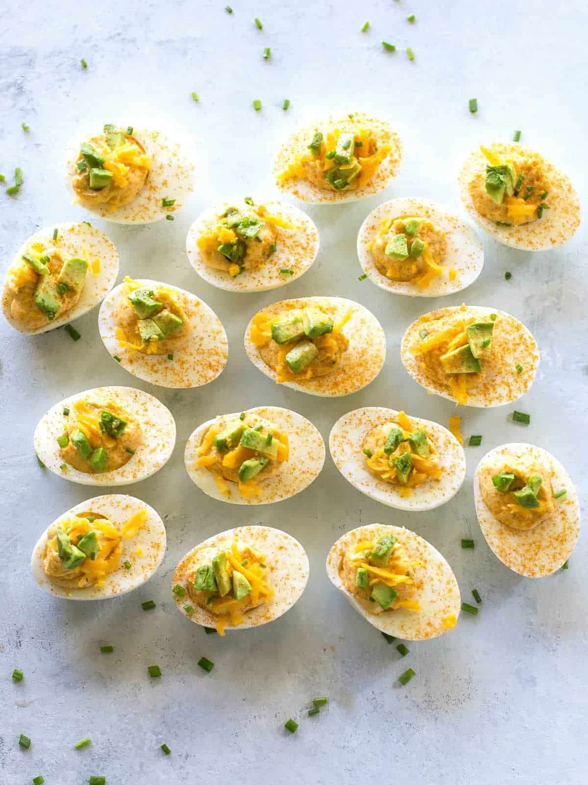 - Top with finely diced avocado and chives. Using a strainer add the remaining 1/2 teaspoon of taco seasoning and very lightly dust the eggs with it. Refrigerate until serving.