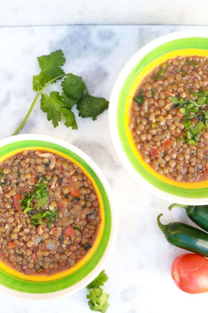Mexican Lentil Soup with tender lentils, crispy bacon, and jalapeño is affordable and nutritious, plus can be made in the Instant Pot or stovetop.