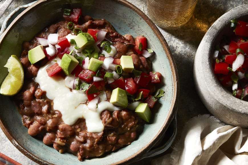 - Ladle the beans into serving bowls and top with the tomato mixture, cheese (let the cheese get uber melty), and avocado. Serve with lime wedges and tortillas, if desired.