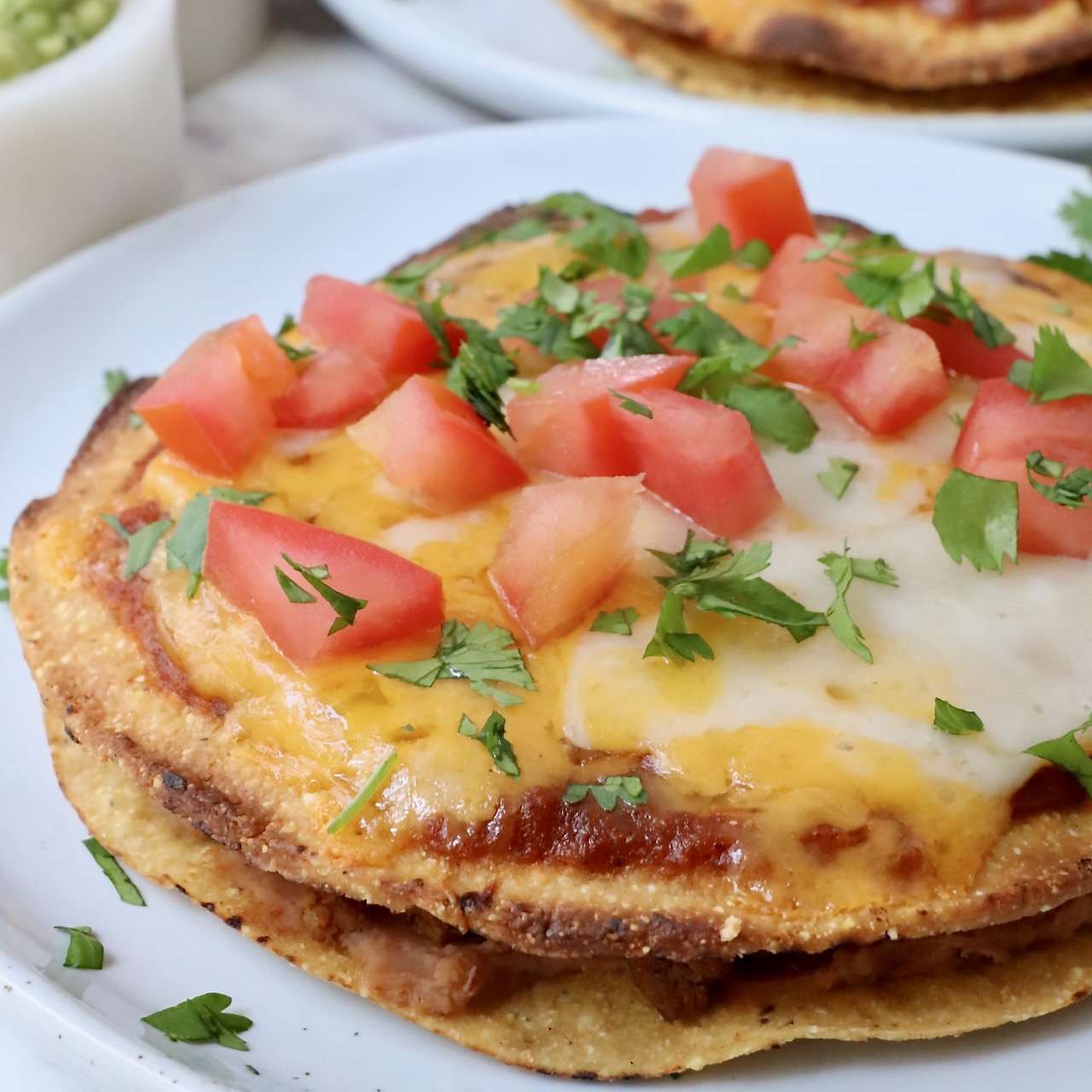 - Layer another tostada shell on top of the ground beef, then spread 2 tablespoons enchilada sauce on each tostada and top with ¼ cup shredded cheese on each one.