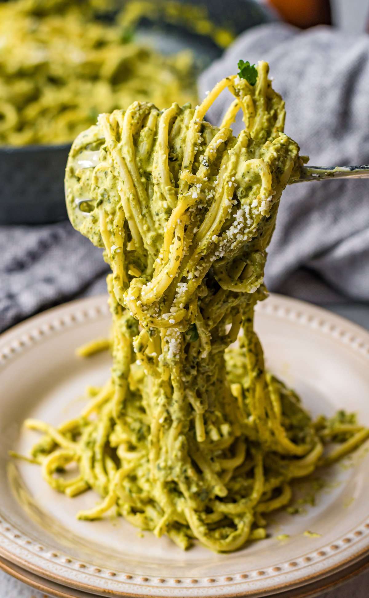 - Place the cilantro, cream cheese, chicken bouillon, cream, milk, and poblanos in the blender. Blend till smooth, then pour into the pan and cook for 5 to 10 minutes until very smooth. If the sauce gets too thick, add some of the reserved spaghetti water to the sauce.