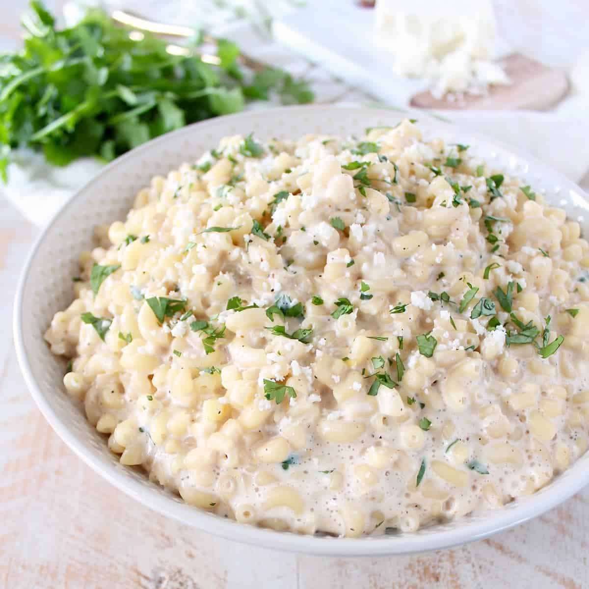 This elote inspired Mexican Street Corn Mac and Cheese recipe is easy to make in just 20 minutes! Serve it up in a big bowl for a creamy, cheesy meal, or as a tasty side dish with fajitas or tacos!