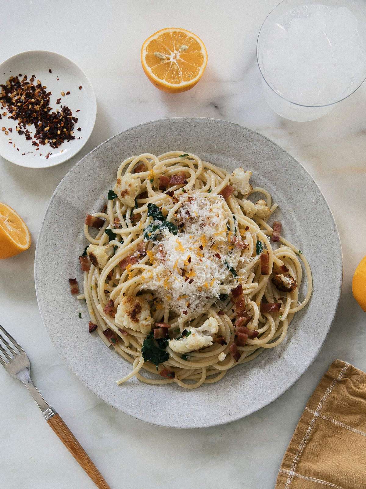 - Preheat oven to 425 degrees F. On one side of a baking sheet, place a cooling rack atop. Lay the bacon side by side on the cooling rack. On the other half of the baking sheet add the florets of cauliflower and toss them with a teaspoon or two of olive oil and sprinkle with salt. Transfer to the oven to bake for about 15 minutes, until the bacon is golden brown and the cauliflower is lightly golden brown. Remove from the oven and allow the bacon to cool for 10 minutes before transferring to a clean kitchen towel or paper towels to drain the bacon. Dice up the bacon into bite-size pieces and set aside. In a large saucepan, set over medium-low heat, add the olive oil, butter, anchovy paste, garlic, and red pepper. When the butter has melted, add the kale, and cook on low until softened, turned a bright color green and wilted. Stir in the lemon zest and juice. Cover the pot and turn off the heat. Meanwhile, bring a pot of salted water to a boil. Cook your pasta according to the package’s instructions, about 9 minutes. Reserve about 1/2 cup of pasta water to the side. Drain the pasta. Pour the pasta water to the butter sauce and bring to a gentle simmer. Add the pasta, along with the Parmesan, Italian parsley and reserved cauliflower; toss until combined. Divide the pasta amongst bowls and top with bacon, more parmesan cheese, pinch of crushed red pepper and lemon zest.