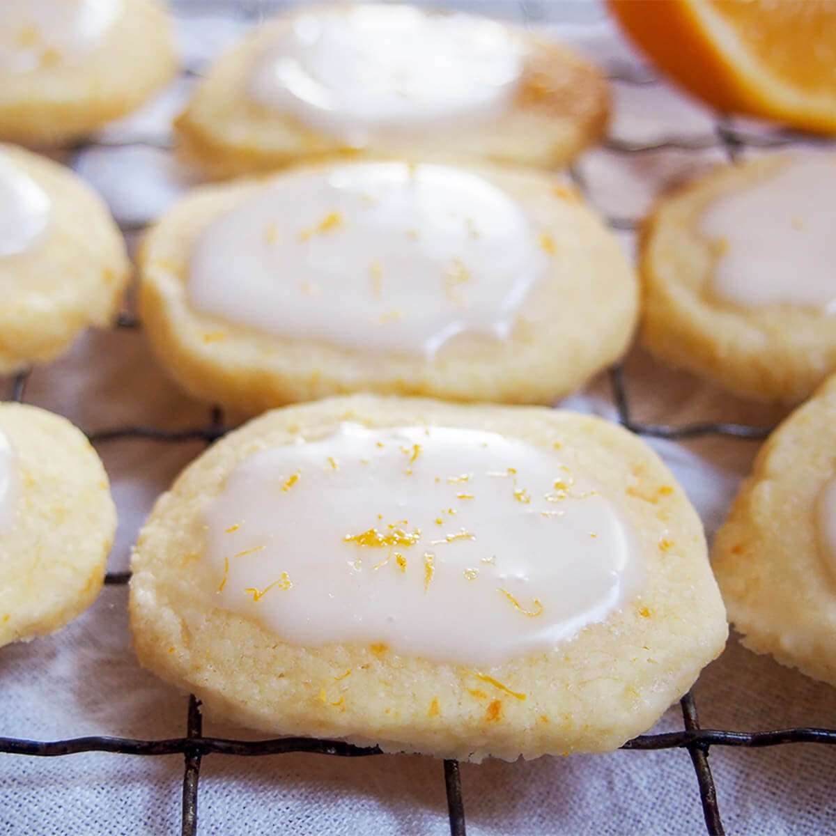 - For the glaze/icing, blend together the sugar and juice (you can also add zest or instead sprinkle a little on top after adding glaze). Either spread a little in the middle of each cookie, as I have, or you could pipe over them too in lines. Store in an airtight container.