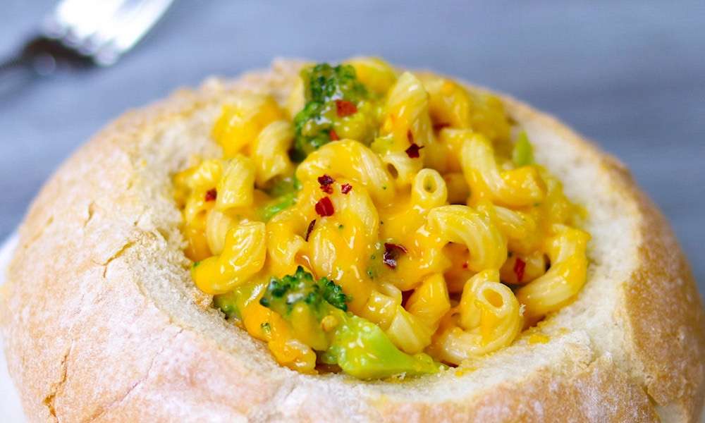 - Serve the mac and cheese on a plate or into a bowl (I used a bread bowl) and top with red pepper flakes. Enjoy!