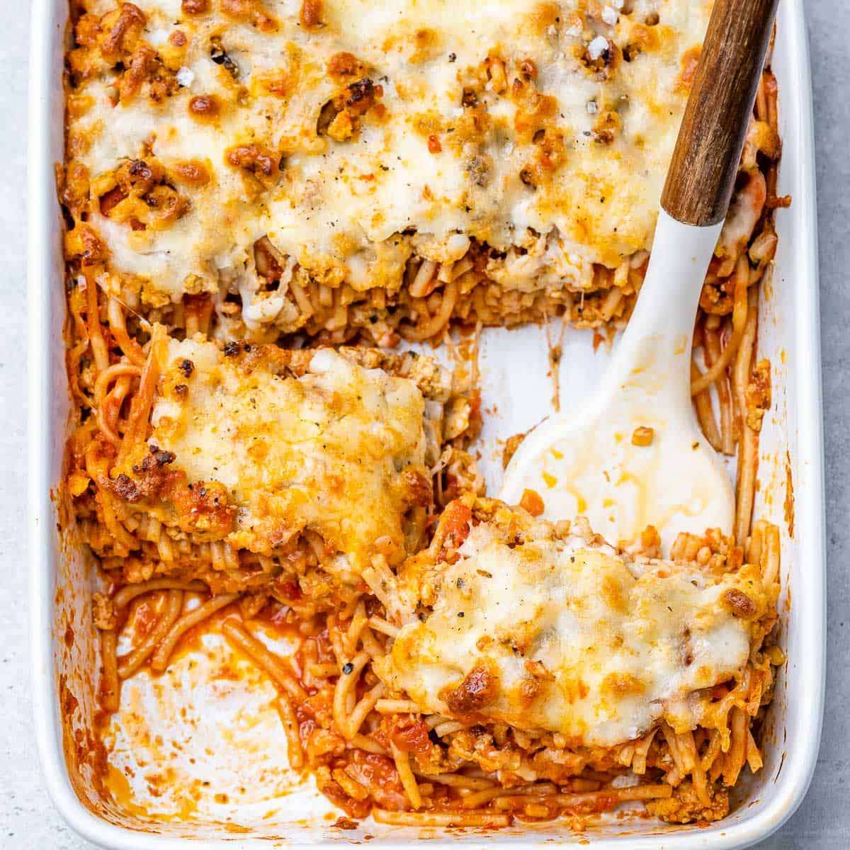 - Spread half of the spaghetti in a rectangular baking dish. Top with half of the cheese mixture and half of the cooked meat, then repeat the layers. Sprinkle with the remaining one cup of shredded mozzarella.