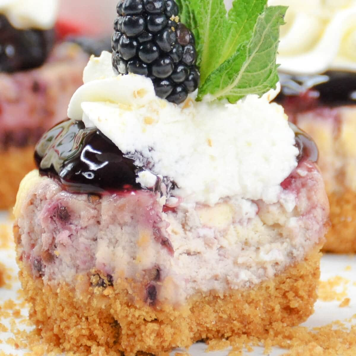These gorgeous miniature blackberry cheesecakes feature fresh blackberries blended into a luscious cheesecake batter, topped with blackberry pie filling and whipped cream!