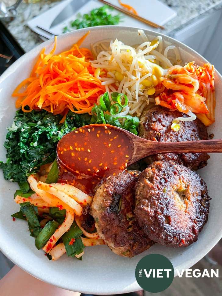 Inspired by Japanese Tofu Hamburger steaks and Korean bulgogi beef, I blended the two to make mini bulgogi hamburger steaks for my bibimbap and ssam (lettuce wraps). It's a great way to stretch a pack of vegan ground and add a softer texture to it!