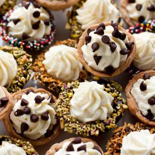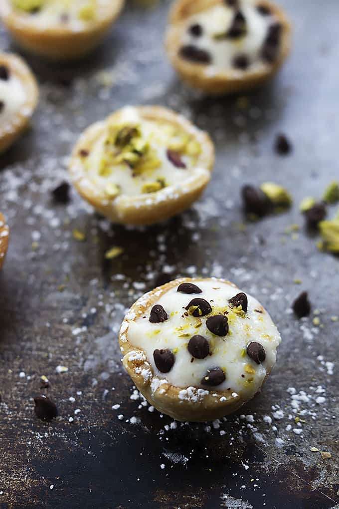 Mini pie crusts filled with easy cannoli cream and topped with mini chocolate chips and crushed pistachios!