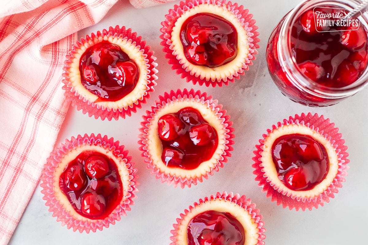 Mini Cherry Cheesecakes are the perfect size for parties and showers, and with just six ingredients, they come together in a snap!