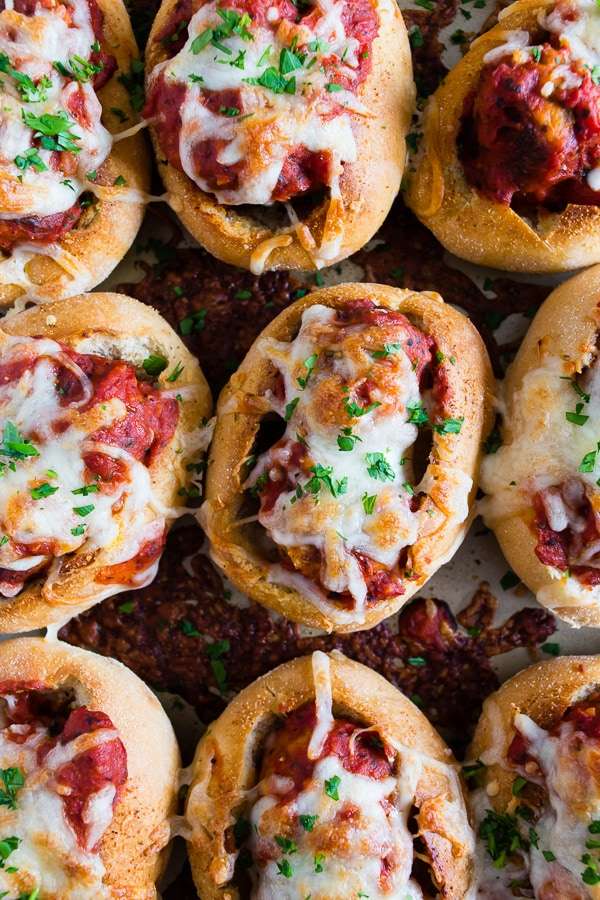 These mini chicken Parmesan meatball subs totally step up your game day food! Stuffed with homemade chicken Parmesan meatballs, tomato sauce and topped with lots of melty mozzarella cheese. Crazy delicious and ready in under an hour!