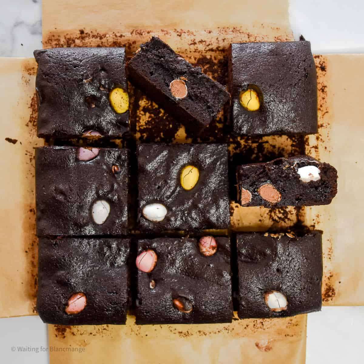 An easy recipe for Cadbury's mini egg brownies. These gooey fudge brownies filled and topped with mini egg chocolates are the perfect Easter brownie treat!