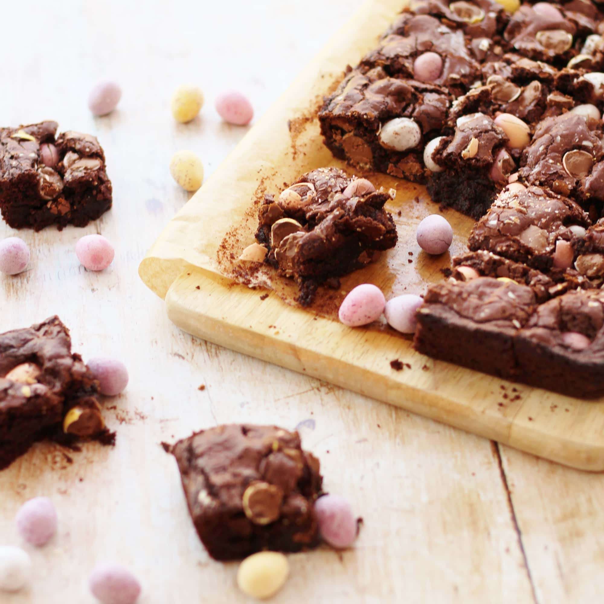 A really easy recipe for gluten free Mini Egg Brownies that are deliciously fudgy and chewy on the inside and crunchy on the outside, stuffed full of little mini eggs, making them perfect for Easter!