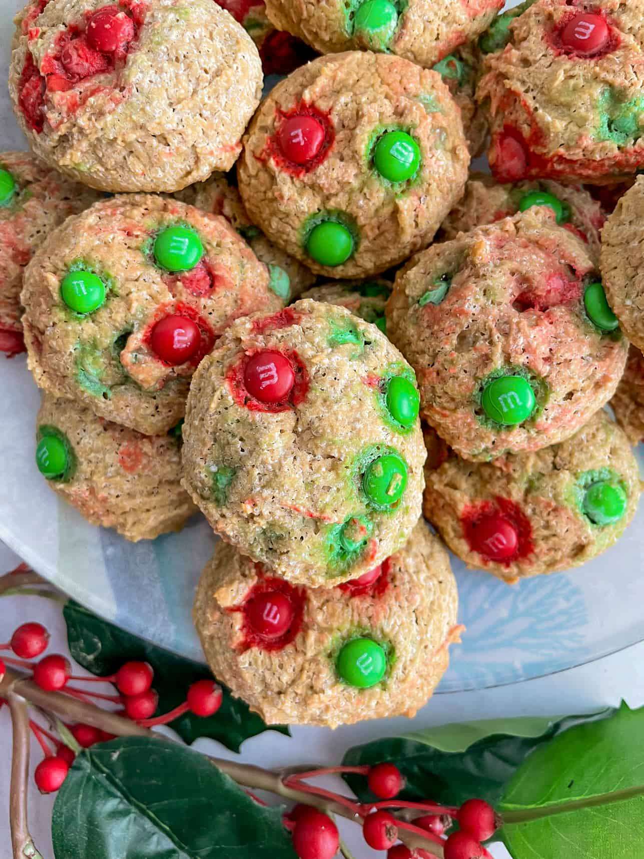Tiny, cute, and so easy to eat, these Mini M&M Christmas Cookies are a hit with adults and kids alike! At only 40 calories a cookie and 10 minutes in the oven, this is a recipe you will for sure make again and again no matter the occasion.
