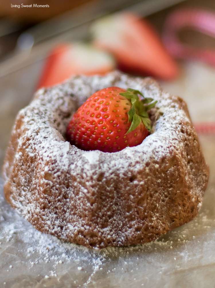 - Fill 3/4 of each prepared bundt cake pans and place them on a cookie sheet for easy transfer. Bake for 25 - 30 minutes or until toothpick comes out clean. Allow them to cool for 5 minutes before removing from the pans. Once they are completely cool, dust with powdered sugar just to make them cute.