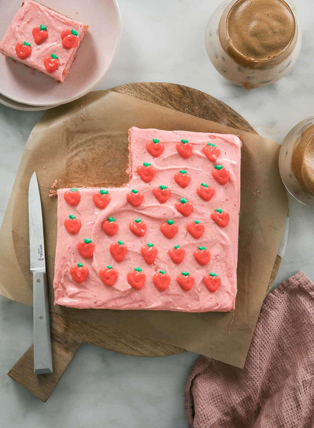 his strawberry mini sheet cake is the perfect small batch cake. It has a deliciously fluffy texture and tastes EXACTLY like a fresh, sweet strawberry.