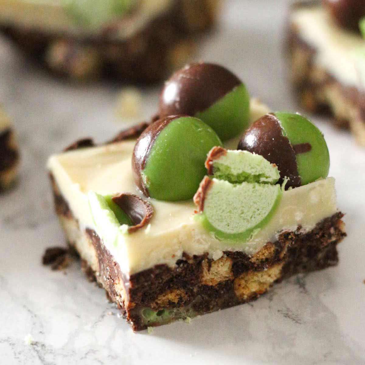 An easy Mint Aero tiffin-style tray bake topped with white chocolate and Aero Bubbles.