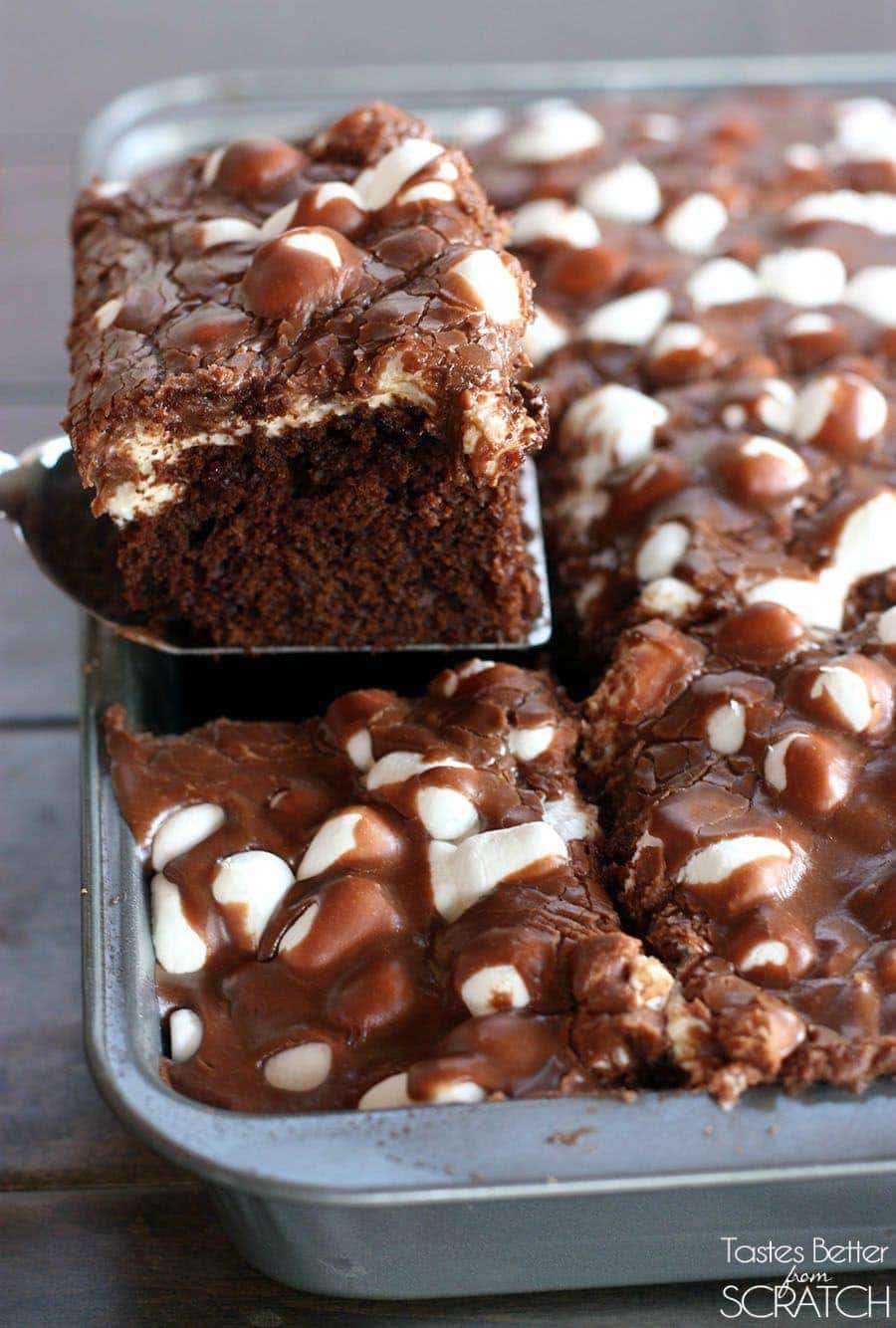 This Mississippi mud cake recipe is a delicious chocolate cake, topped with melted marshmallows and warm chocolate frosting.