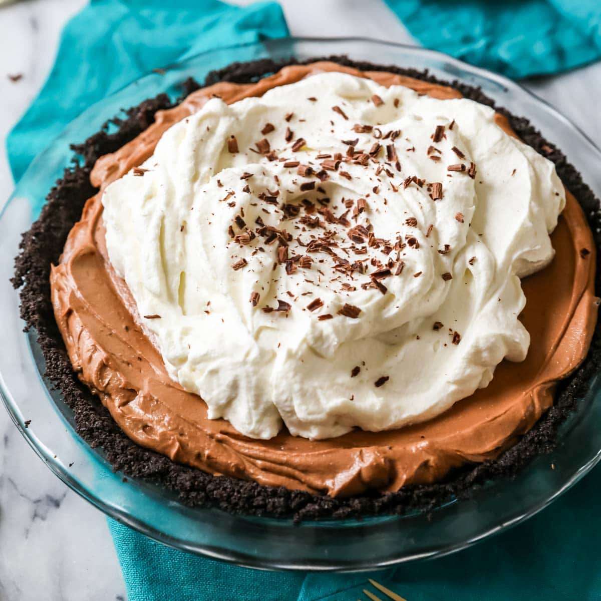 - Spread (or pipe) remaining whipped cream over the chocolate filling. Cover and return pie plate to fridge and allow it to sit until firm (at least 4-6 hours, preferably overnight).