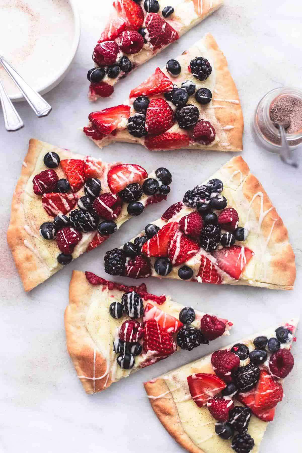 - Top with berries. Whisk together powered sugar, milk, and vanilla, adding more milk as needed to thin to desired consistency. Drizzle over berries. Sprinkle with cinnamon sugar, cut, and serve.
