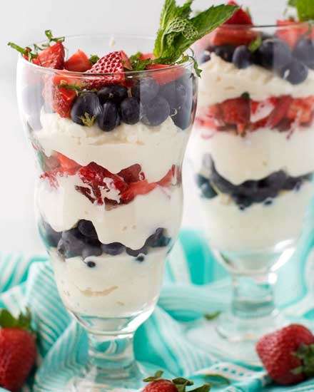 - To assemble parfaits, add a couple spoonfuls of ricotta mixture to the bottom of tall clear glasses. Top with a layer of blueberries, more ricotta, a layer of strawberries, then repeat until glasses are full. Garnish with a sprig of mint if desired.