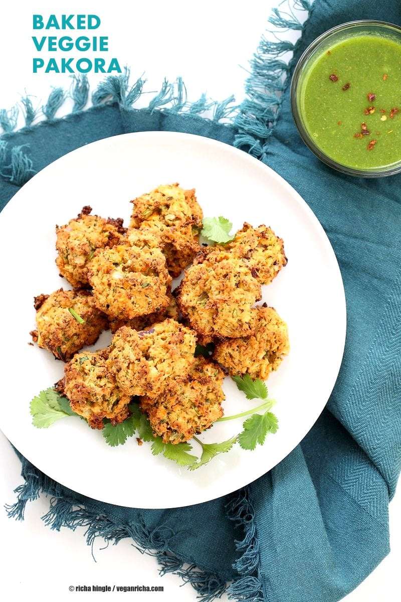 Broccoli, Cauliflower, potatoes, carrots and greens in this Mixed Vegetable Pakora. Baked Veggie Pakore Bhajjiya. Vegan Soyfree Recipe. Easily Glutenfree. I use all raw veggies in these as the veggies cook through easily if grated small. Makes 12 to 16 fritters