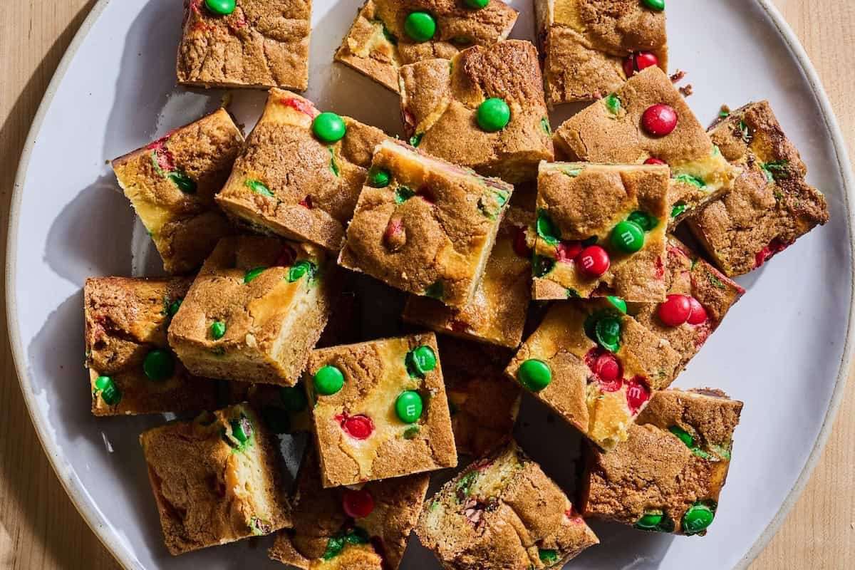 - Prepare the Cookie Dough: In a large stand mixer, cream the butter, brown sugar, and granulated sugar together on medium speed for 3 minutes, until light and fluffy. Scrape down the sides of the bowl as needed. Add the eggs and vanilla extract, mixing until fully incorporated.On low speed, gradually mix in the flour, salt, baking soda, and baking powder until a dough forms. Toss in 1 cup of Christmas M&M’s and mix for just a second to distribute them evenly. Chill the dough in the refrigerator while you prepare the cheesecake layer.
