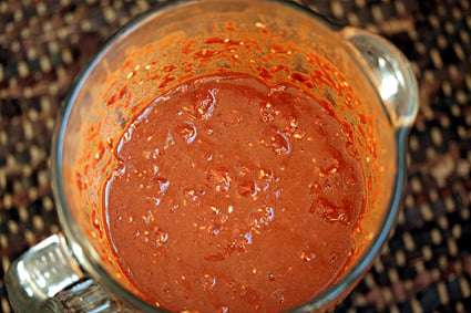 - Remove the seeds and stems from the chiles and soak them in very hot water until soft, about 30 minutes or so. (Make sure they're submerged by setting a lightweight bowl on top of the chiles.) When softened, puree the chiles in a blender. If the skins are tough, you may want to pass the puree though a food mill or strainer.