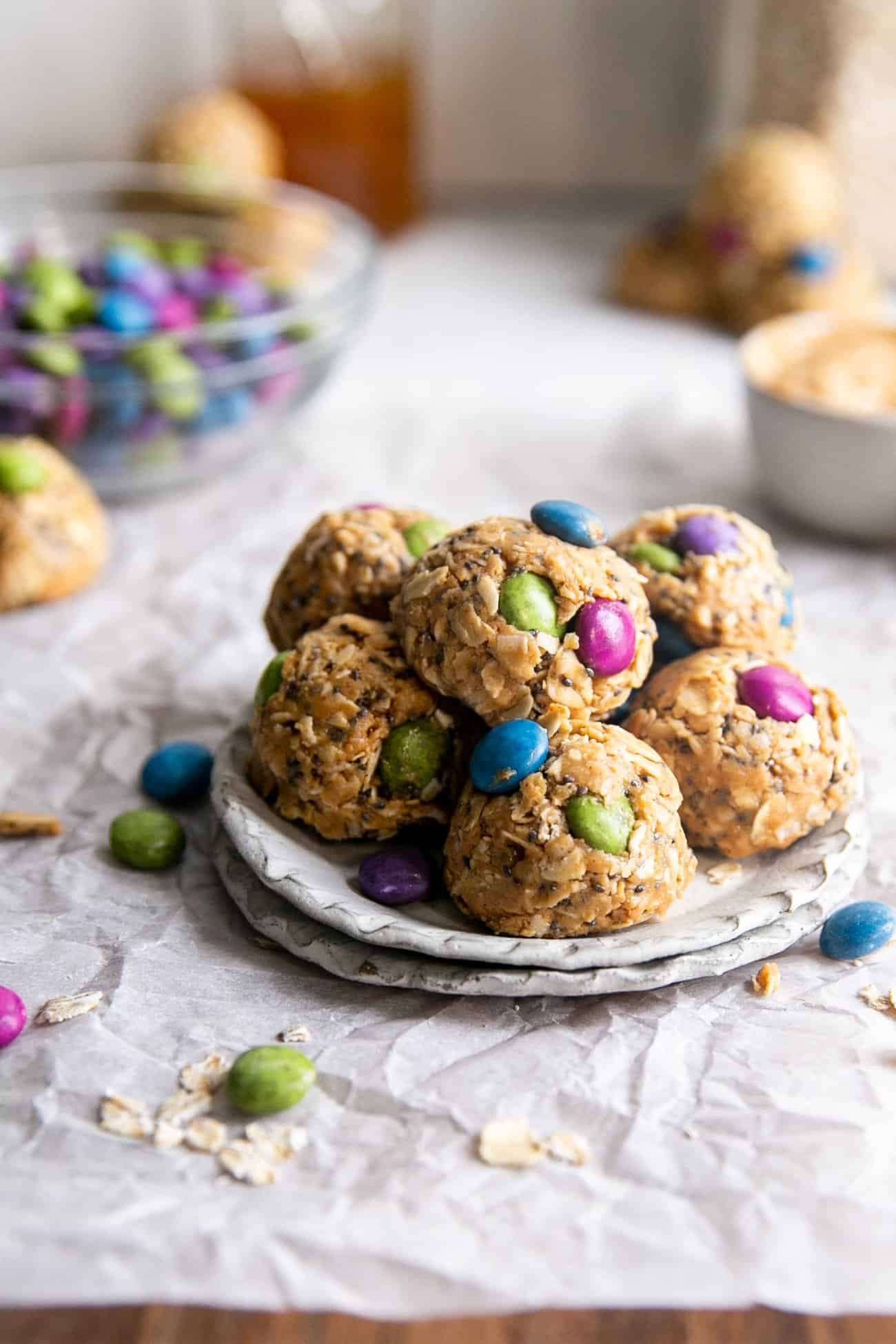 If you love Monster Cookies, then these energy balls are for you! It's like eating Monster Cookie dough, but in healthy little oatmeal bites. No bake, easy to make, great for kids and adults alike!
