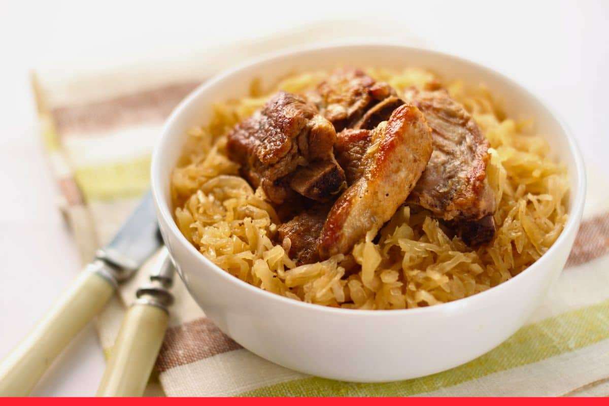 - Drain the sauerkraut in a container and retain the liquid (you can also give it a rinse if you like it less sour).
