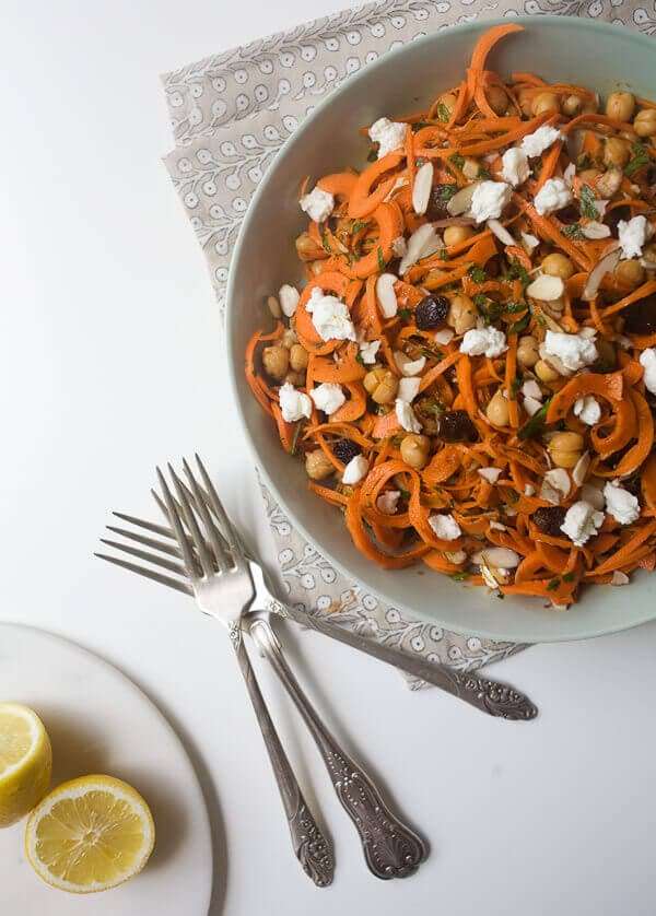 Moroccan Carrot Noodle Salad with Golden Raisins, Goat Cheese and Harissa