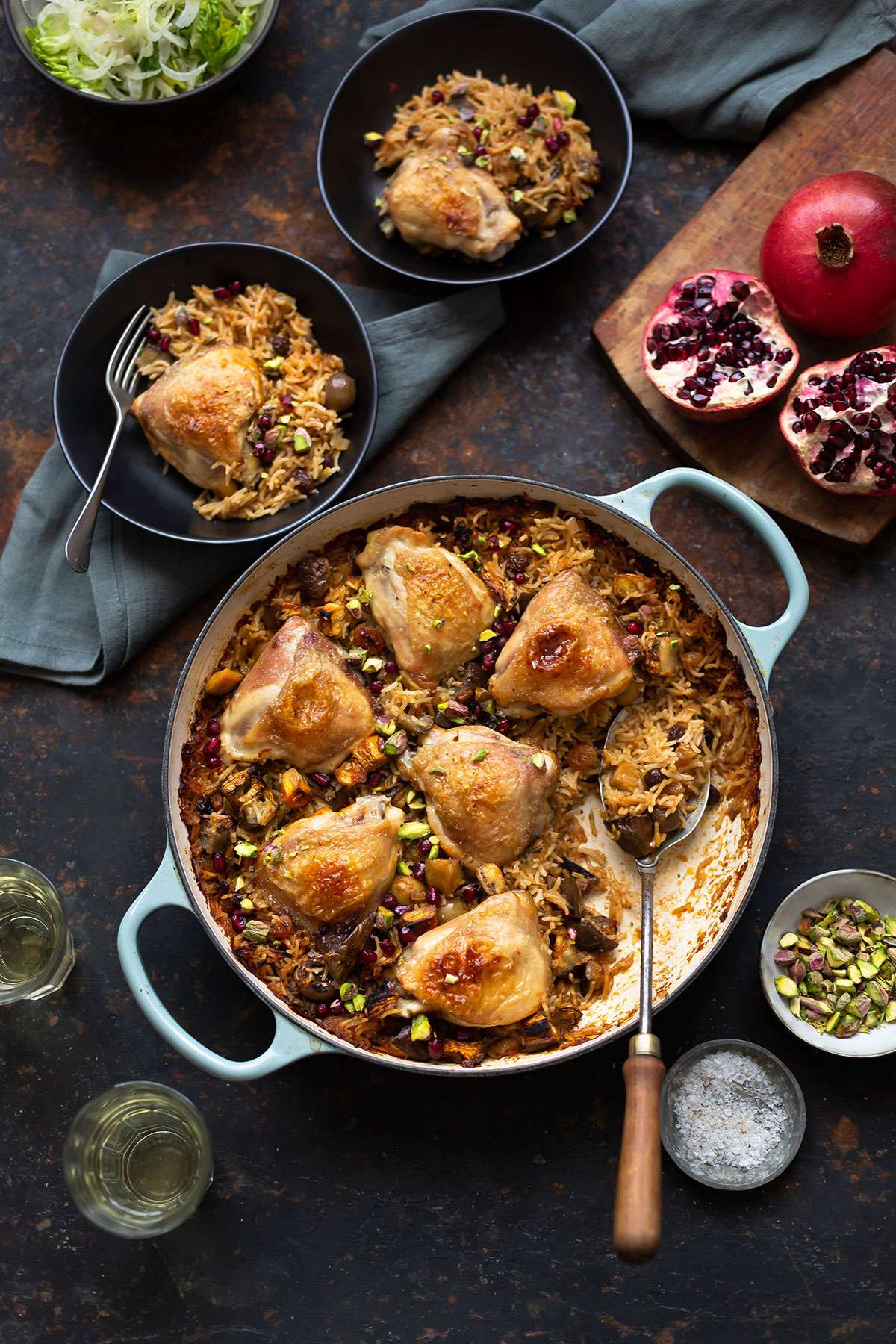 - Cook uncovered for 40 – 45 minutes and until the chicken is golden brown and cooked through. Cook a little longer if you are unsure. Scatter the pistachios and pomegranate seeds over to serve.