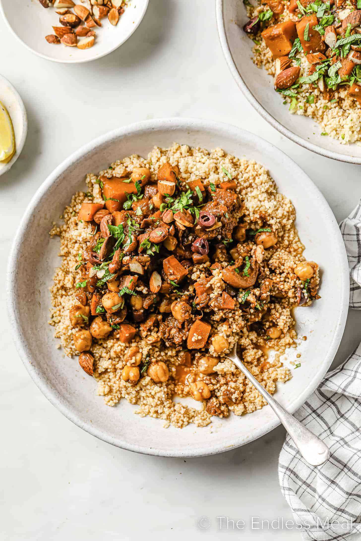 This Moroccan vegetable tagine is sweet, fragrant, and completely delicious. Carrots, sweet potatoes, and chickpeas are cooked with warm spices and served over a bed of couscous. Make it in a crockpot or instant pot for a low-effort vegan meal that everyone will enjoy!