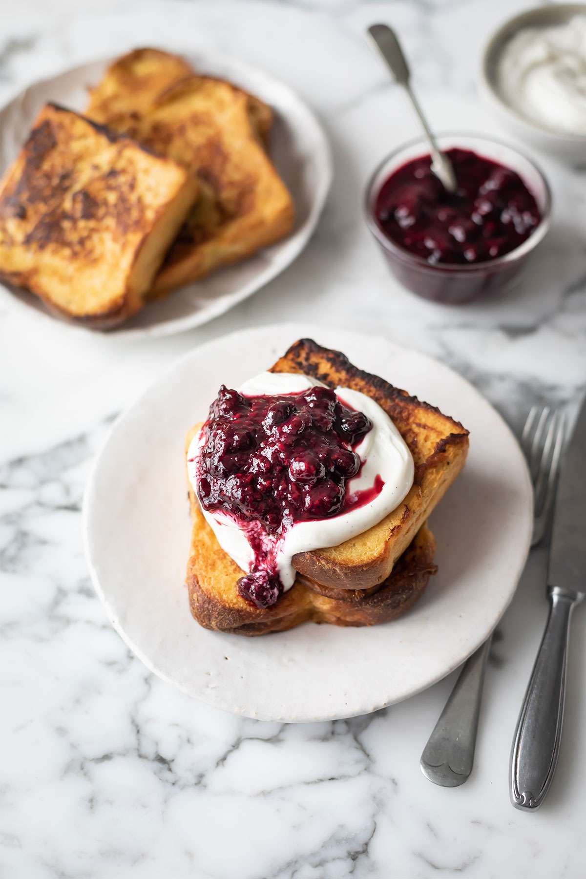 A delicious recipe for Cape mossbolletjie French toast topped with whipped vanilla cottage cheese and a mixed berry compte