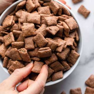 - Pour into a glass. Top with Chex, peanut butter, more chocolate chips & a sprinkle of powdered sugar.