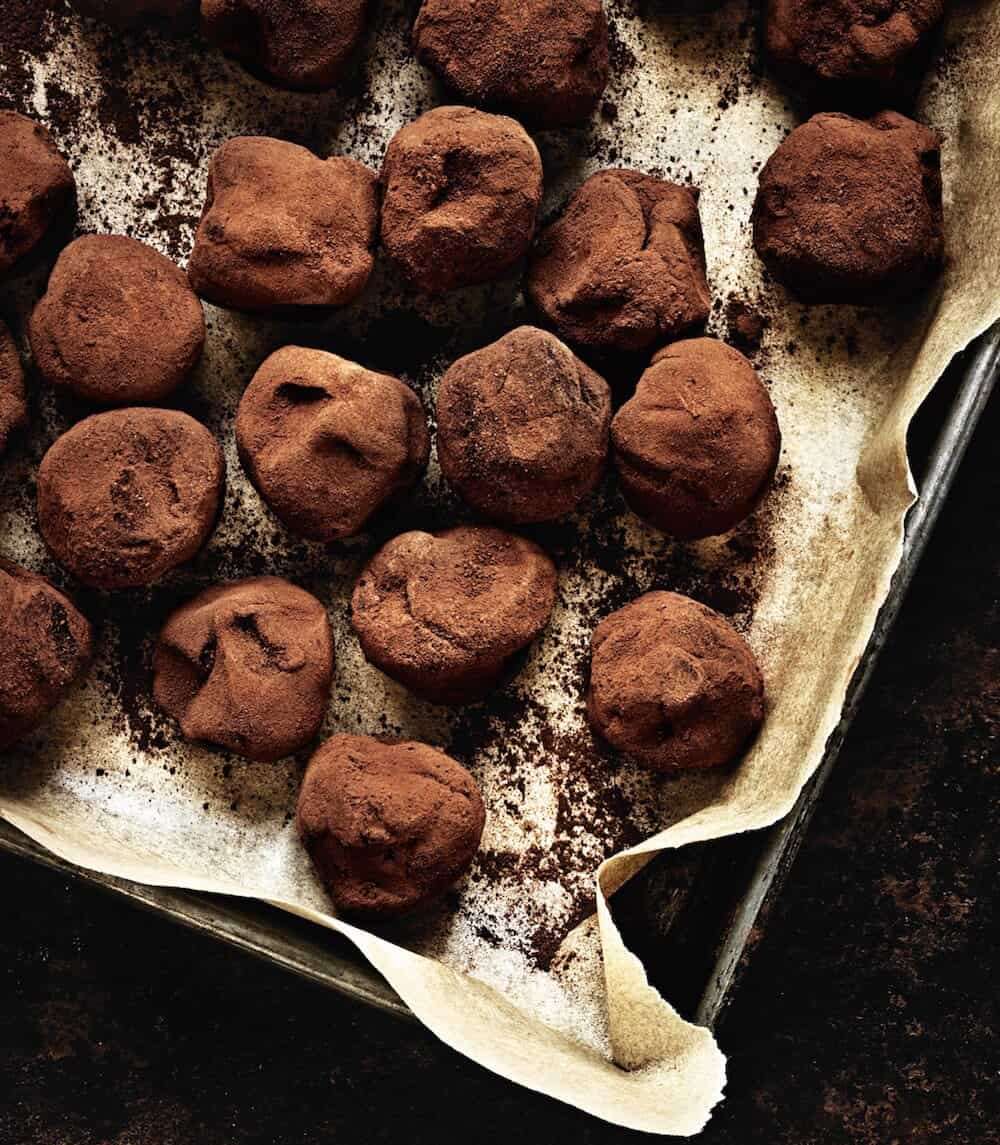 - Now, take a generous amount of the ganache and, having dipped your hands into the dry mixture, form your desired sphere – or feel free to leave the truffles rustic.
