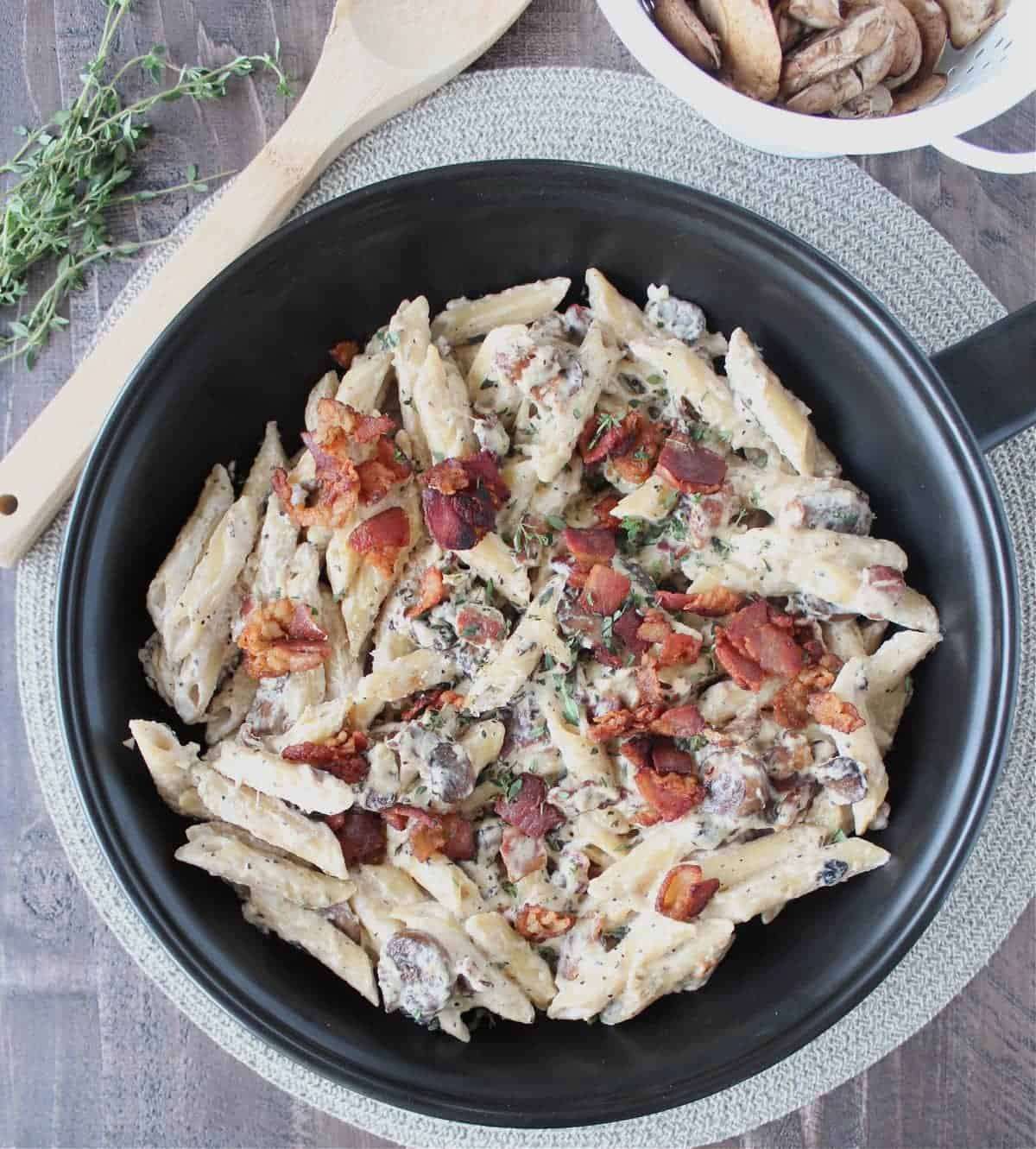 Sautéed mushrooms and crispy bacon add flavor and texture to this scrumptious cheesy pasta recipe, made in just 29 minutes!