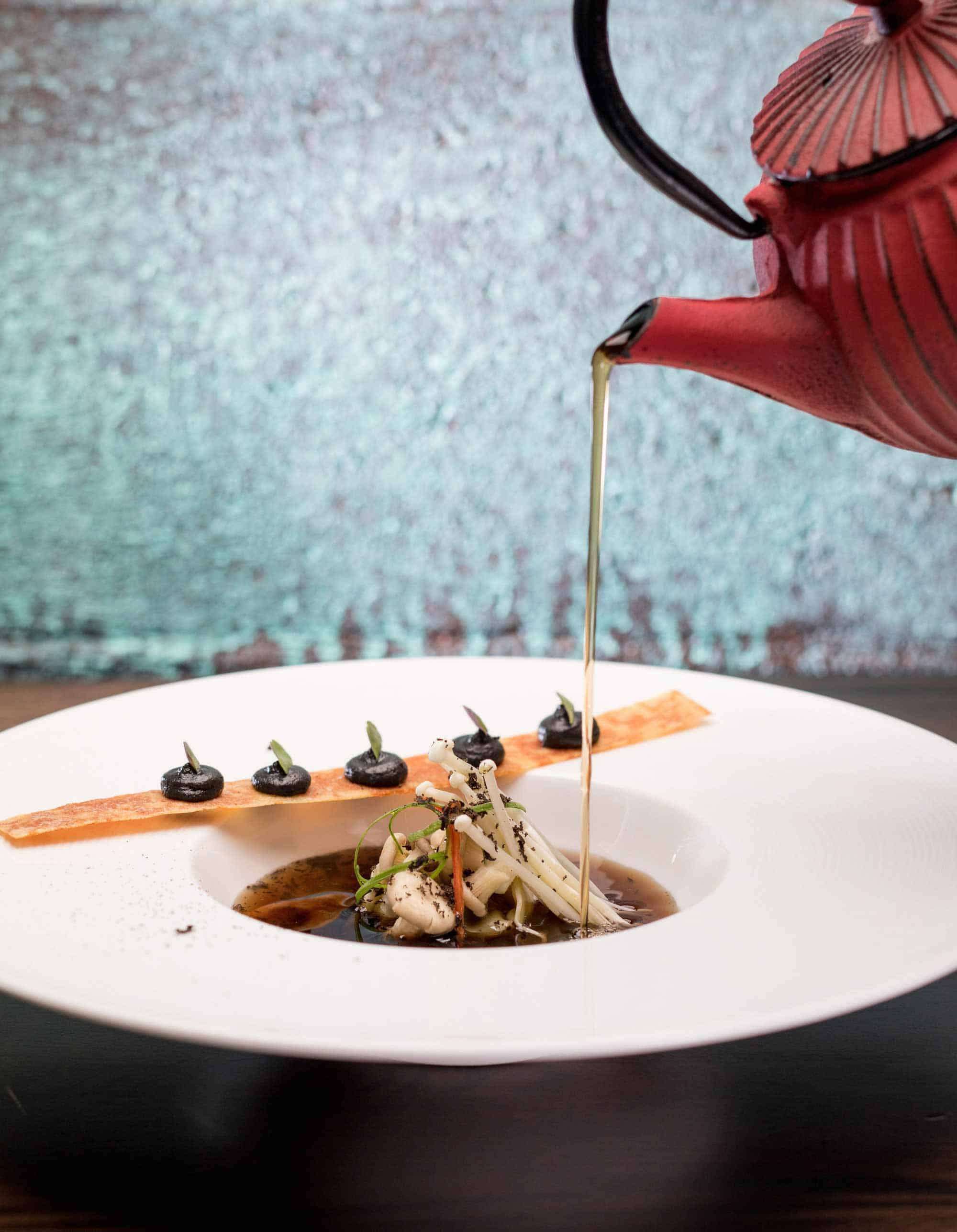 - Divide the dumplings into 4 serving bowls, add the cooked mushrooms, pour over your mushroom consommé, drizzle a little truffle oil and garnish with finely chopped tarragon and red chili.