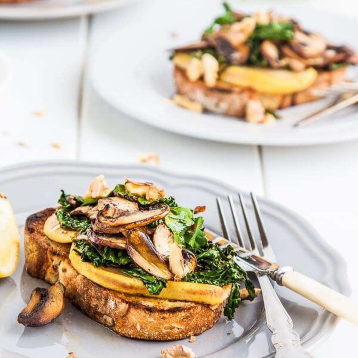 These scrumptious brunch toasts are topped with earthy mushrooms and slightly bitter cavolo nero which contrast beautifully with sweet pear and leeks. The finishing touch is a sprinkling of toasted walnuts.