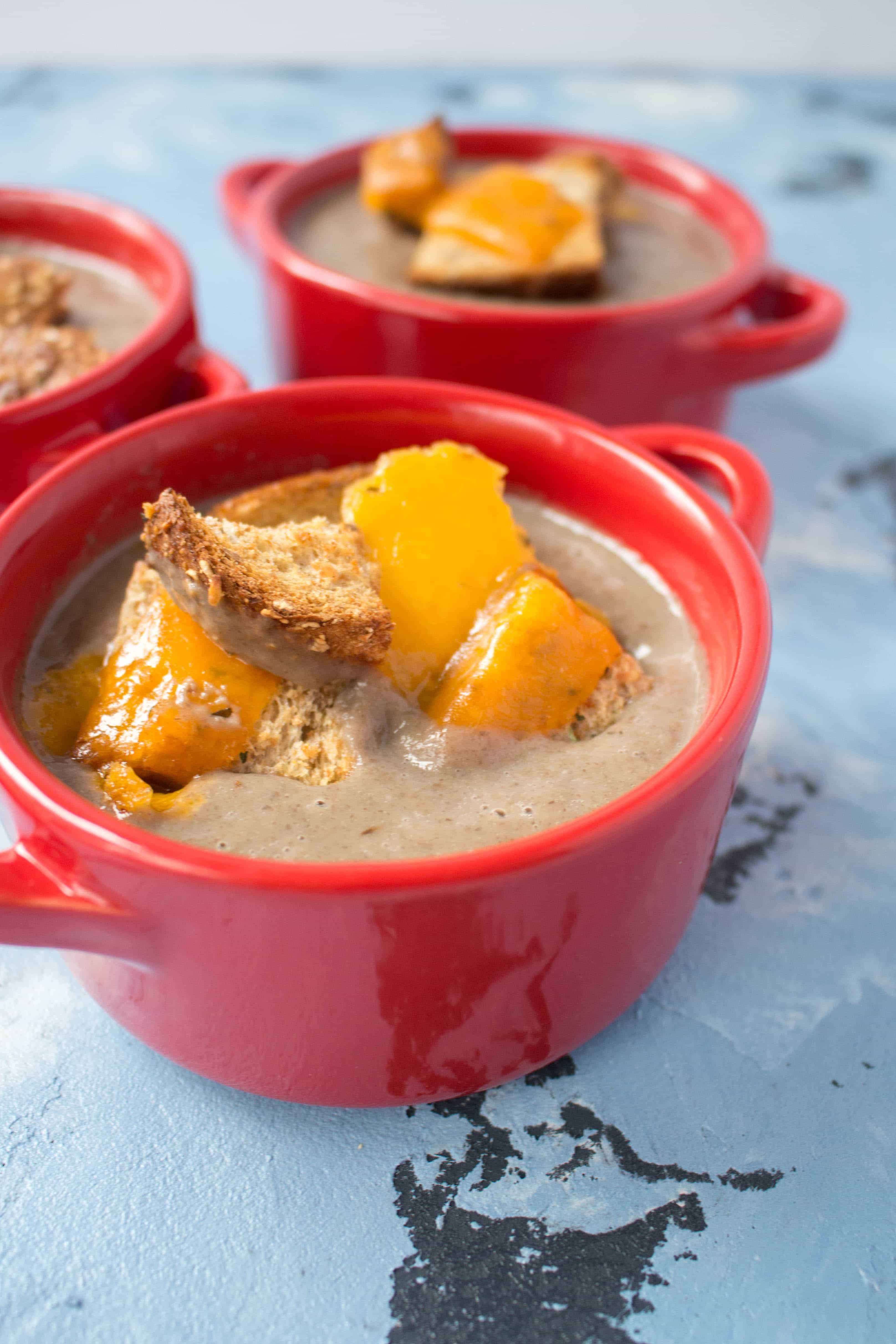 An easy mushroom soup with a twist! Substitute regular croutons for tuile style cheesy croutons instead!