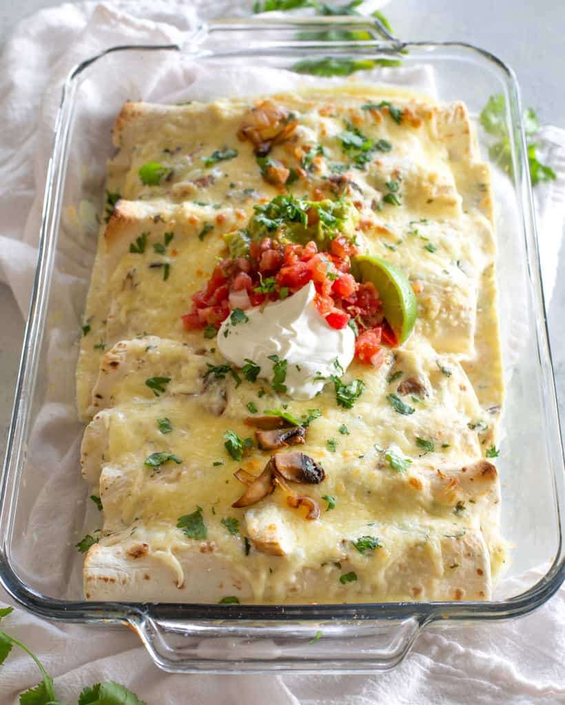 These Mushroom, Spinach, and Chicken Enchiladas are creamy enchiladas topped with a cilantro sour cream sauce. This Mexican chicken recipe is company worthy.