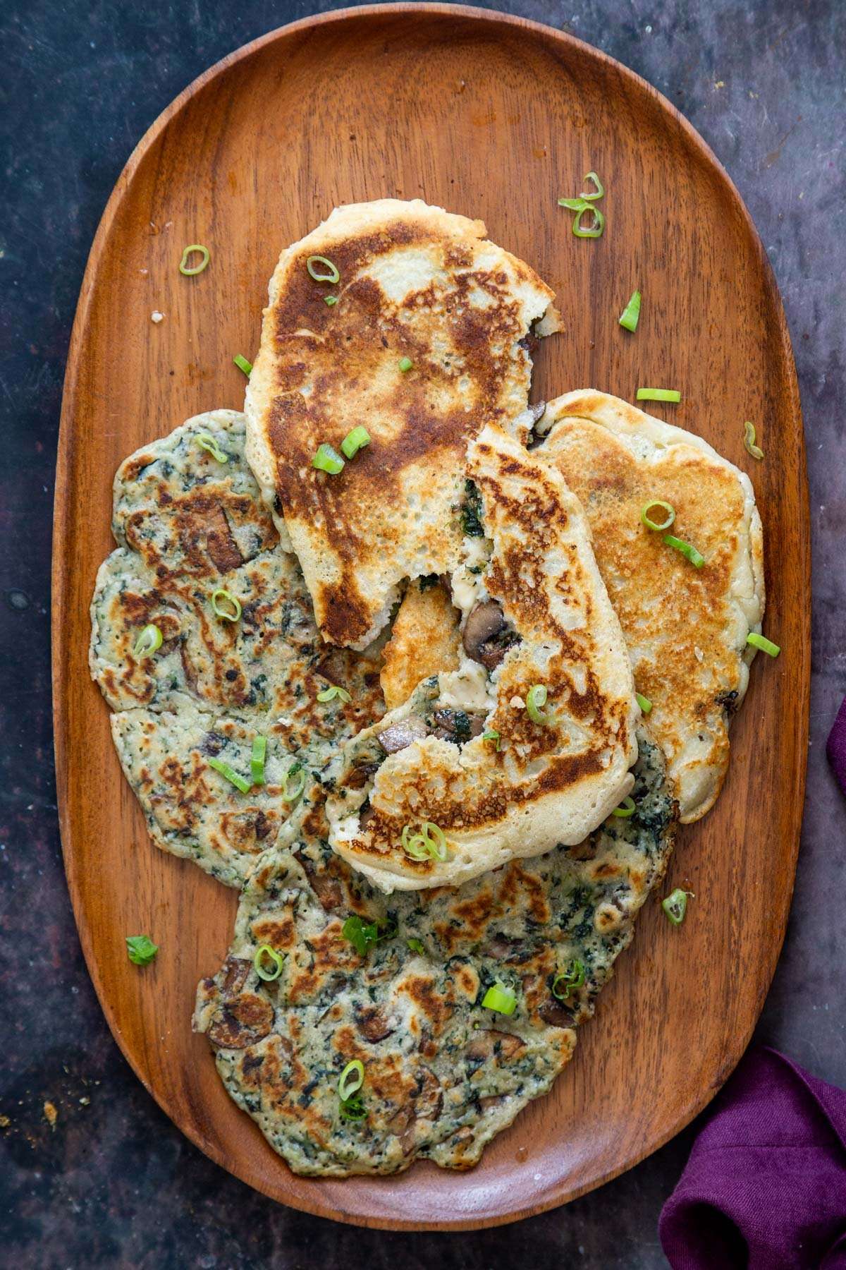 - To make the filling mixed in batter naan; mix the mushroom filling into the batter and add vegan cheese if you like. Then spread that batter onto the heated skillet with a spatula or a spoon. Cover with the lid and cook until golden brown. Flip it, cover it with the lid and cook on the other side as well until golden, another minute or so. Remove from the skillet and repeat with the remaining batter.