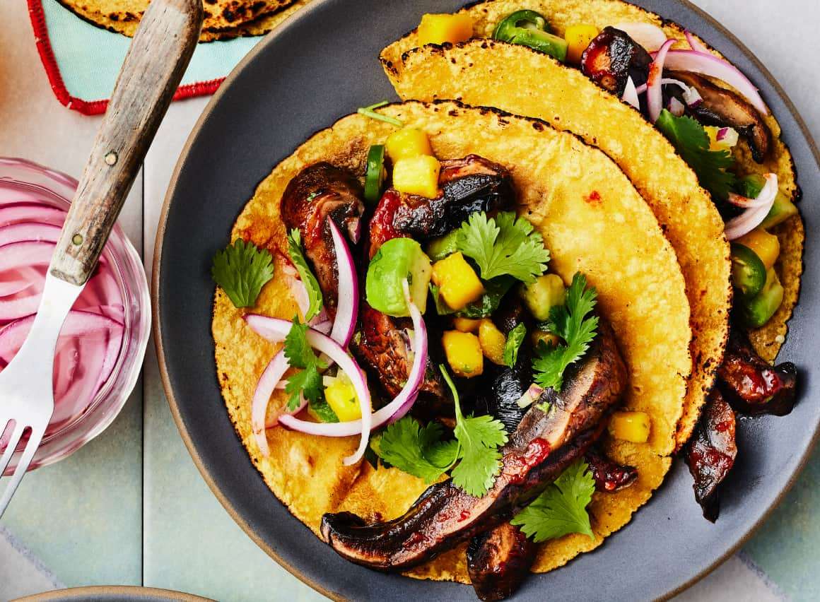 - Assemble tacos in the tortillas with the sliced mushrooms, avocado salsa, pickled red onions, and cilantro. Serve with lime wedges.