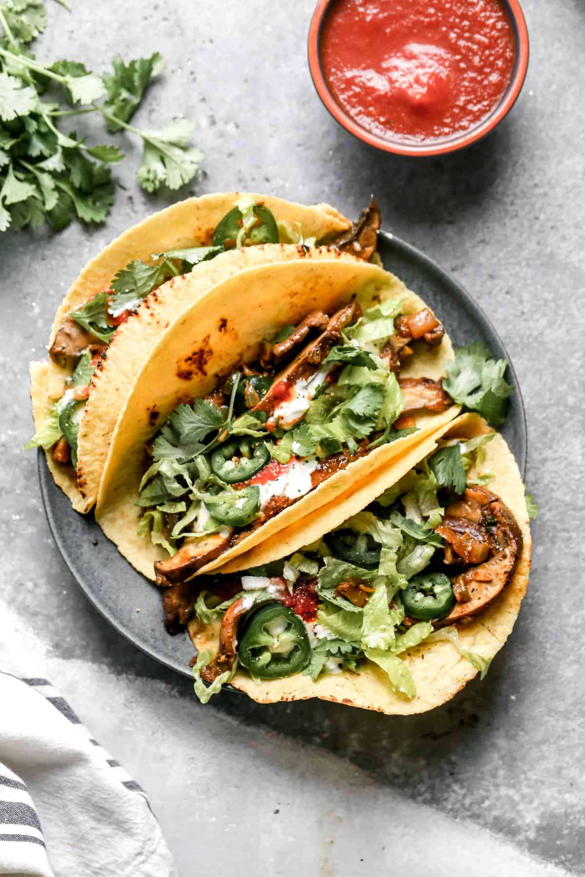 - Mushrooms: Portobello mushrooms are preferred for tacos as they are “meatier” in texture, where cremini mushrooms get really soft when cooked.