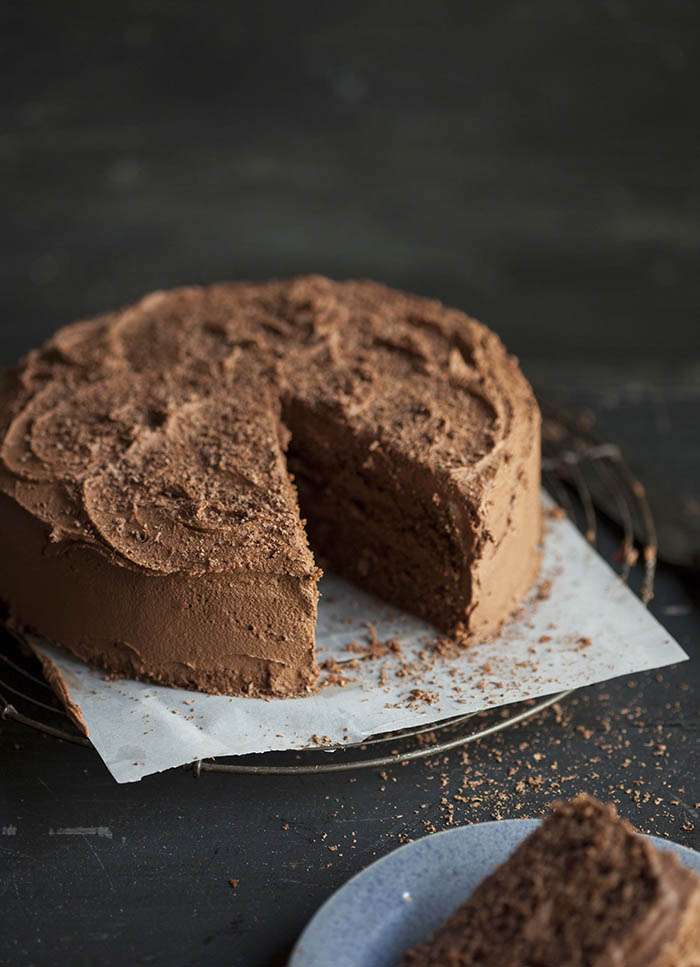 - Ice the cake by generously spreading a layer of frosting in the middle, top and sides.