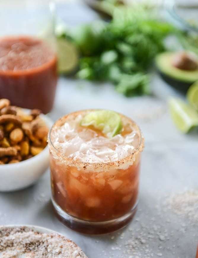 - Mix the salt and chili powder together on a plate. Rim the edge of the glasses with a lime wedge, then dip in the salt and cover the rim.