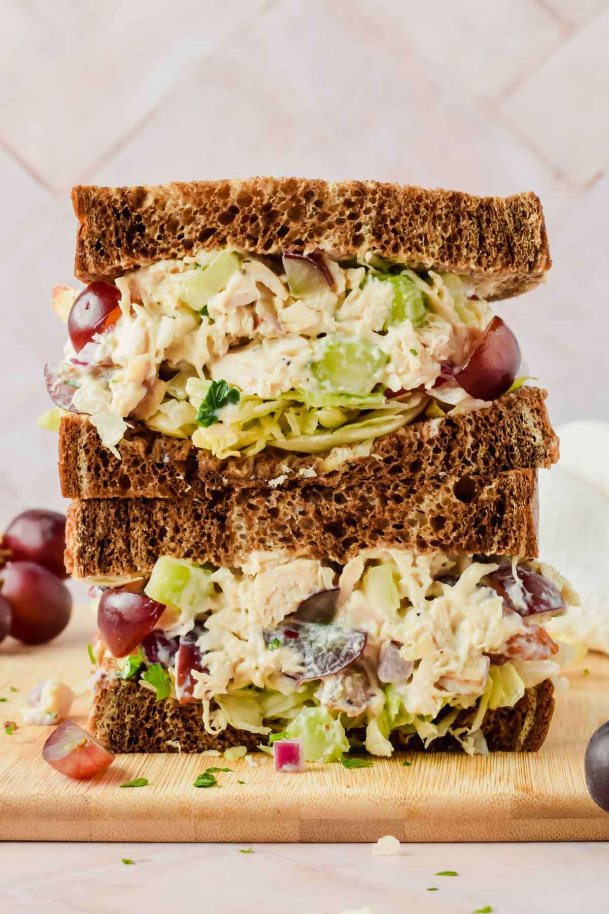 - Build the sandwiches! Add lettuce and sliced tomatoes onto one half of each sandwich and ¼ of the chicken salad recipe to the other piece of bread.
