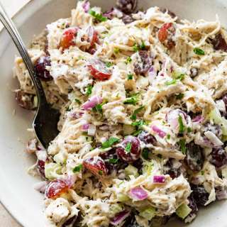 - Add the rest of the ingredients to the mixing bowl: shredded chicken, diced celery, onions, red grapes, and sliced almonds. Fold together until everything is well coated.